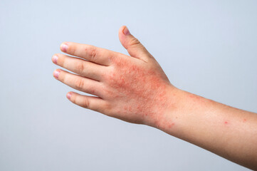Les symptômes typiques sont des plaques rouges, des papules, des démangeaisons et parfois un angiœdème avec gonflement du visage ou des muqueuses.