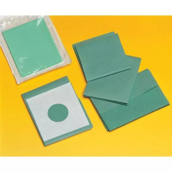 Boîte de 50 Champs Optima non tissés/PE troués avec adhésifs LCH - L'adhésif se trouve au niveau du trou - Chaque champ est emballé individuellement - Disponible en plusieurs dimensions