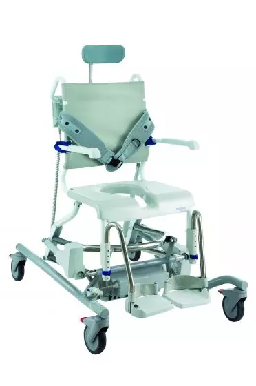 Chaise de douche Invacare Aquatec Ocean E-Vip" - En acier inoxydable - Assise réglable en hauteur - dossier et assise combinés inclinables par vérins, - Montage sans outils - Large gamme d’accessoires - Repose-pieds - Poids : 39 kg - Garantie : 2 ans
