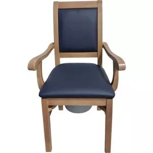 Accoudoirs et repose-pieds amovibles Equipé de 4 roues, dont les 2 arrières avec frein Livré avec un seau et son couvercle Hauteur du siège : 50 cm Dimensions de l’assise : 44 x 44 cm Matériaux : structure en métal chromé, assise en simili cuir noir, seau et couvercle en plastique Poids maximum autorisé : 100 kg