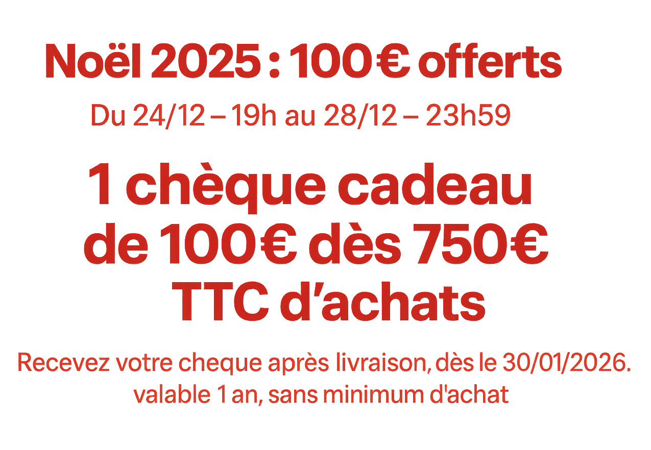Pour toute commande d’un montant de 750 € TTC minimum, réalisée entre le 24 décembre à 19h00 et le 28 décembre à 23h59, bénéficiez d’un chèque cadeau d’une valeur de 100 € offert.