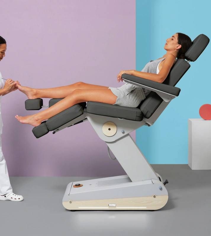 Les jambières séparées, dotées de vérins à gaz actionnés par levier, offrent une manipulation fluide et sécurisée. Leur extension intégrée permet d’ajuster facilement la longueur selon la taille du patient, garantissant confort et stabilité pendant toute la durée de la séance. Le fauteuil de podologie autorise également des positions spécifiques telles que la position Antigravity, améliorant la circulation et réduisant les tensions musculaires.