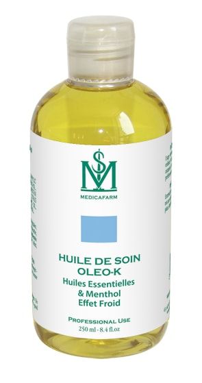 L'huile de soin OLEO-K a été spécialement conçu à partir de 100% d'origine végatale. Dans cette huile, vous retrouvez pleins d'huiles essentielles apaisantes pour l'organisme. Elle est d'une qualité supérieure et procure une sensation de fraicheur. Sa formule va détendre et stimuler votre corps. Grâce à son bouchon STOP-Goutte, le produit est très économique et il suffit de déposer que quelques gouttes afin de réaliser votre massage. Vous pouvez utiliser cette huile pour vos massages courts ou prolongés. Cette huile sert notamment à favoriser la rééducation ainsi que la manipulation. Elle est très utilisée dans le milieu sport pour la récupération après les efforts, ainsi que pour traiter les douleurs musculaires et articulaires.