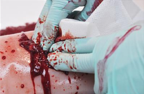 Le simulateur reproduit fidèlement une plaie profonde, permettant de s’entraîner au packing ainsi qu’à l’utilisation de compresses hémostatiques dans des conditions proches du réel. Le sang de simulation TrueClot réagit avec les compresses pour former des caillots visibles et cohérents, offrant une expérience immersive et pertinente pour l’acquisition des bons gestes.