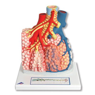 Ce modèle de lobule pulmonaire externe agrandi 130 fois met en évidence les structures suivantes : Bronche segmentaire et ses divisions terminales (bronchioles) Alvéoles pulmonaires, ouvertes côté droit Vaisseaux pulmonaires et leurs réseaux capillaires Branche d'une artère bronchique Plèvre pulmonaire Septum du tissu conjonctif sur le côté gauche Chaque alvéole pulmonaire ouverte avec le réseau ...