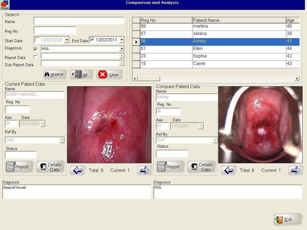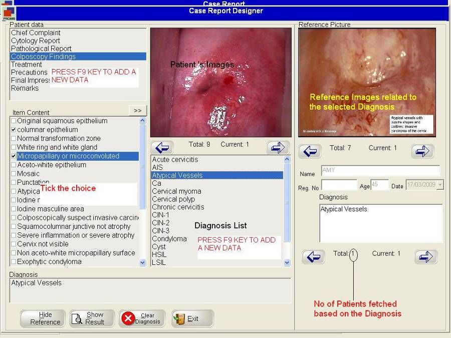 Modules spécialisés : examen médico-légal, rapports de cryochirurgie, représentation graphique des données, diagnostic multi-format (1-4 images), graphique HAMMOND pour biopsies.