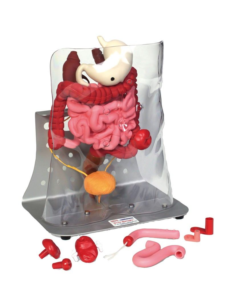 Cet ensemble vous fournis un dispositif complet : une base en aluminium anodisé, une strucure rigide en forme de torse dotée de 4 orifices vous permettant d'atteindre l'anatomie interne, un estomac, le petit ainsi que le grand intestin, un rectum, les reins, l'urètre, la vessie, deux sections supplémentaires du petit intestin, deux adaptateurs, 4 types de stomies : 0.9 cm de diamètre, 5 cm de diamètre, et deux de 8 stents.
