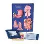 Il s'agit de la représentation du système digestif comportant des représentations détaillées de la bouche, des glandes salivaires, de l'œsophage, de l'estomac, du foie, du pancréas, et de l'intestin. Avec une section et une vue agrandie de l'estomac et de l'intestin. Description en anglais.