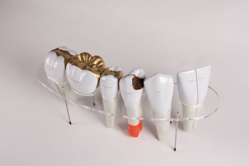Cet appareil dispose d'une incisive latérale amovible, d'une canine, d'une prémolaire avec un plomb, d'une première molaire avec une couronne, et d'une seconde molaire.