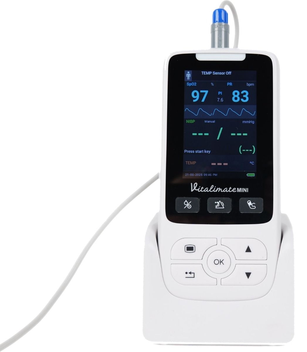 Le Spengler Vitalimate Mini offre une surveillance des signes vitaux précise et rapide grâce à sa technologie avancée et son format compact. Ce moniteur multi-paramètres mesure la SpO₂, la fréquence cardiaque et, selon la version, la pression artérielle non invasive (PNI), répondant aux besoins de tous ceux qui recherchent un outil fiable, portable et facile à utiliser.