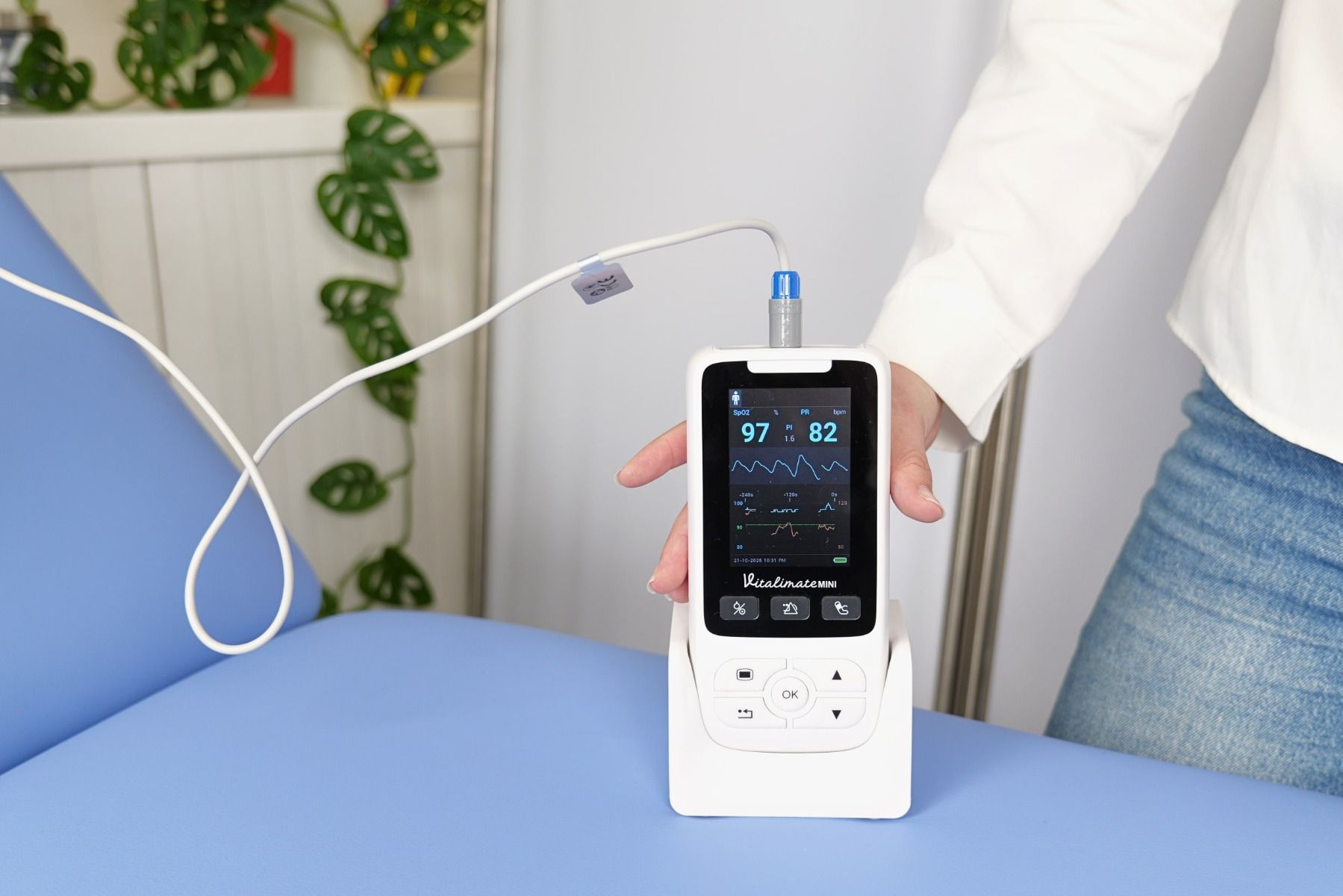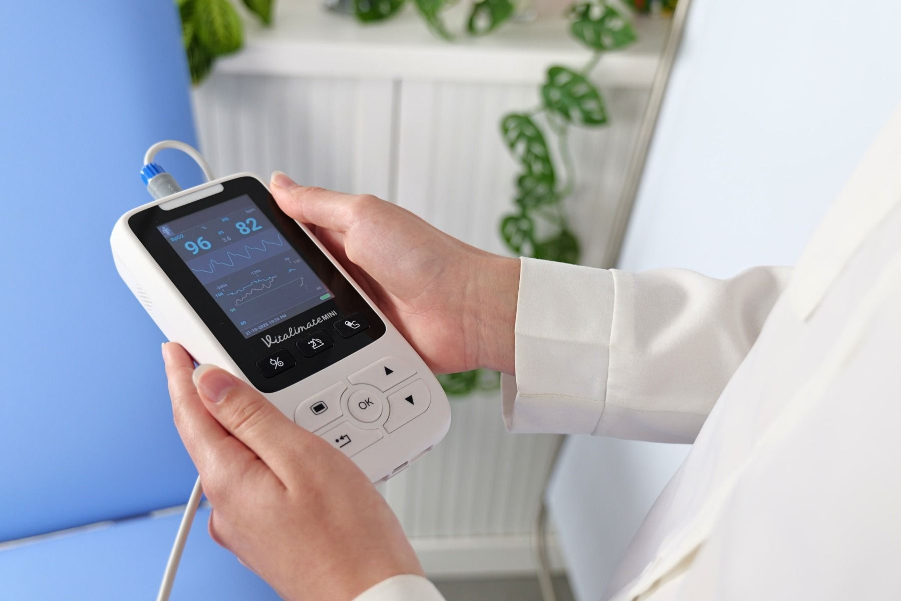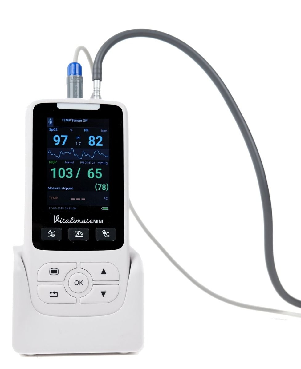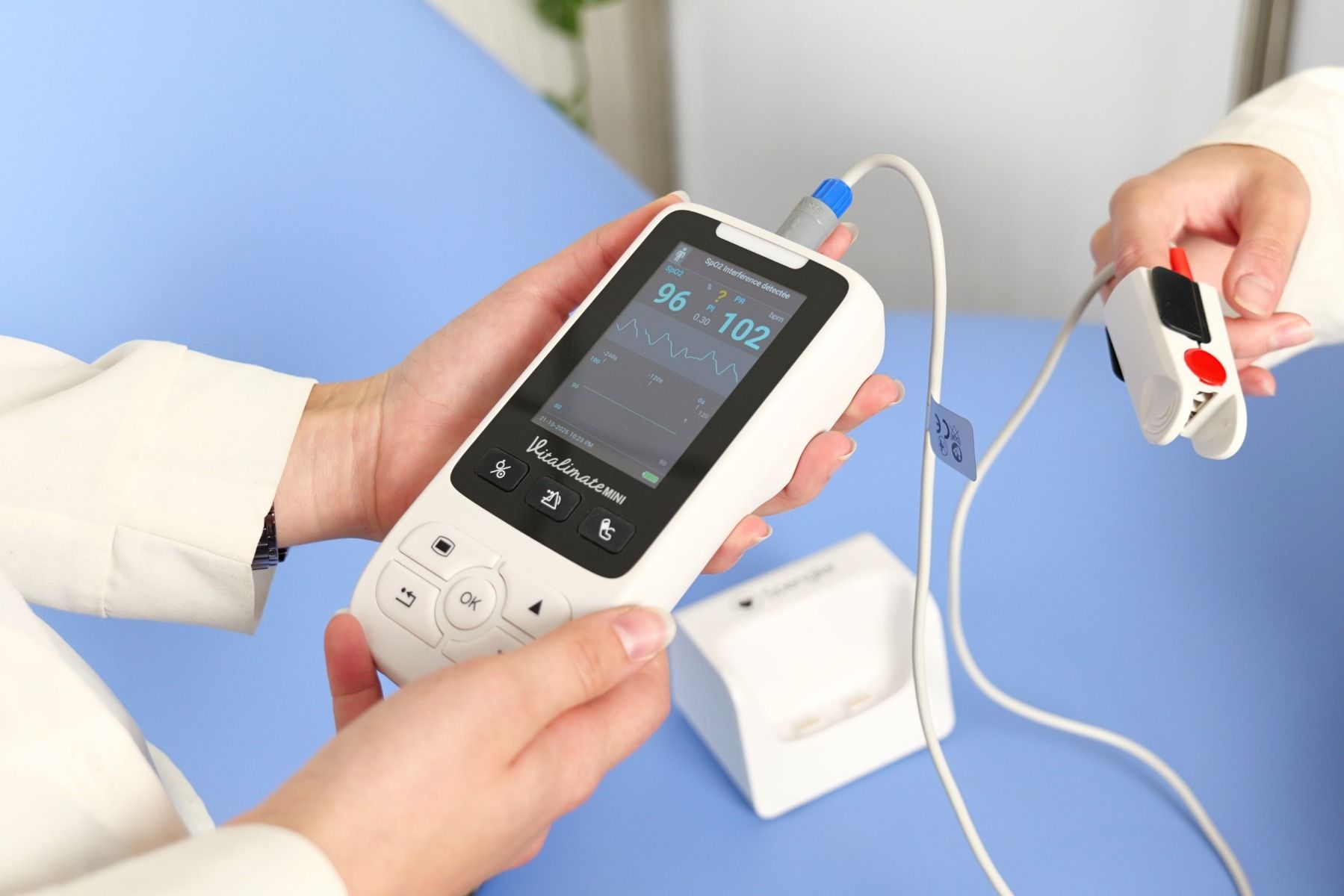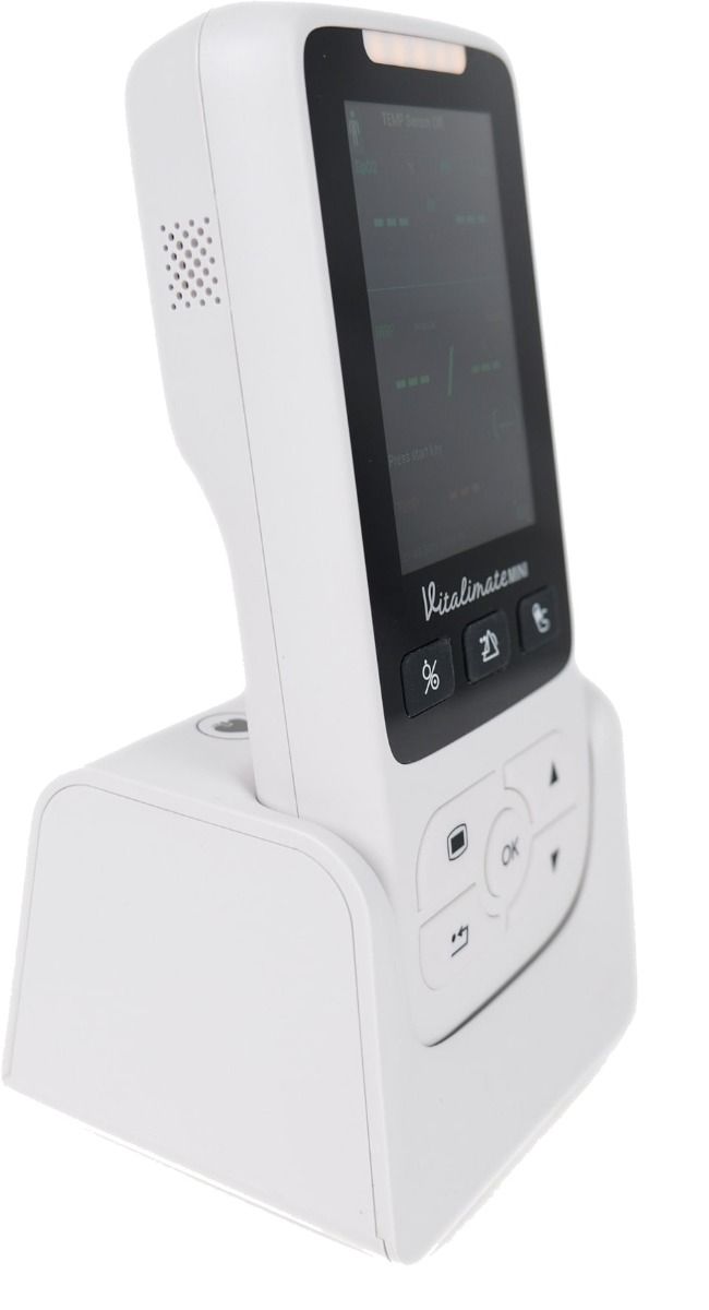 Avec un poids léger à partir de 280 g et un socle double fonction alliant recharge et stationnement, le Vitalimate Mini combine mobilité et autonomie. Il assure jusqu’à 12 heures d’utilisation continue et peut atteindre 24 heures en mode stationnaire, idéal pour les longues gardes ou les interventions à domicile.