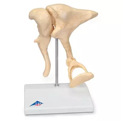 On appelle osselets les trois plus petits des os humains, qui sont reliés entre eux et situés dans l'oreille moyenne. Malleus (marteau), Incus (enclume) et Stapes (étrier). Leur fonction est de transmettre les sons entrants de la membrane tympanique par la fenêtre ovale jusqu'à l'oreille interne et l'amplification mécanique du son. Si des sons particulièrement forts sont perçus il est nécessaire de protéger l'oreille interne contre des lésions irréversibles. Ceci est permis grâce à un réflexe qui déclenche l'activité musculaire (M. stapedius). Ensuite le stapes bascule momentanément et le son n'est transmis que partiellement. Un autre muscle sert à protéger la chaîne des osselets contre les mouvements violents (par exemple lors des éternuements ou de la toux) (M. tensor tympani), il est situé sur le malleus et tend la membrane tympanique. Une maladie typique qui concerne les osselets et qui conduit à une surdité croissante avec leur rigidification est l'otosclérose. Notre modèle montre un moulage et un agrandissement des osselets originaux avec micro-TC.