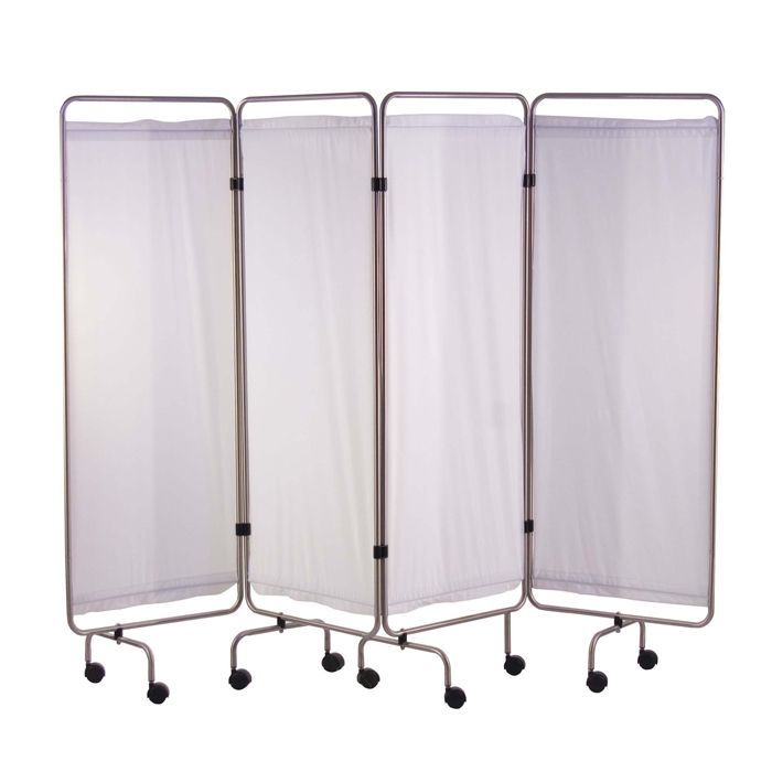 Caractéristiques techniques du paravent en inox 4 panneaux avec rideaux tendus blancs Holtex : Paravent en inox 4 panneaux avec rideaux tendus blancs Holtex - Panneaux (155 x 61 cm) avec roulettes non dissociables sans frein - Châssis réalisé en tube d’Acier Inoxydable - Rideaux en plastique lavables - Classement résistance au feu : M3 - Roulettes doubles. Diamètre : 60 mm - Poids : 13 kg - Référence : OTA0064 - Garantie : 1 an