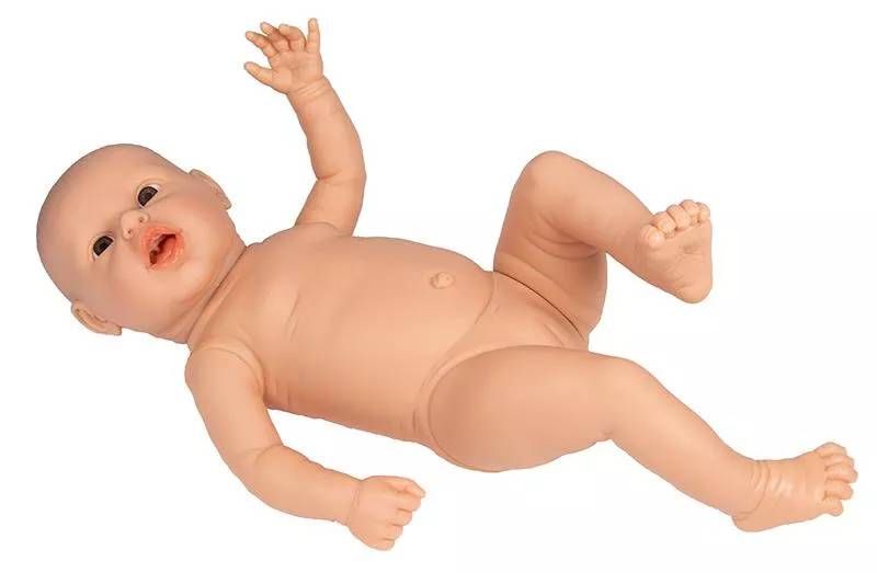 Avec sa bouche entrouverte, la poupée fille pour parents BA101 peut être utilisée pour simuler la tétée. Le cordon ombilical ressort volontairement pour plus de réalisme et pour l'entraînement à l'entretien de cette partie sensible. Les plis de la peau permettent de s'entraîner correctement au nettoyage de la peau.