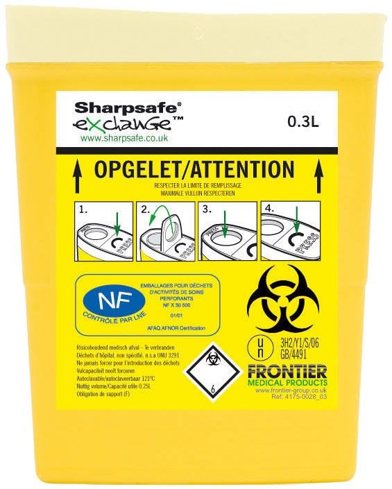 > 0,3 l Boîte monobloc jaune à couvercle translucide en Polypropylène. Capacité utile : 0,25 l. Dimension de l´ouverture C : 40 x 30 mm. Dimensions (HxLxl) : 130 x 105 x 50 mm. Poids : 0,064 kg. Ouverture, simple pression, large avec déconnexion d´aiguilles simples. Lot de 10 pièces