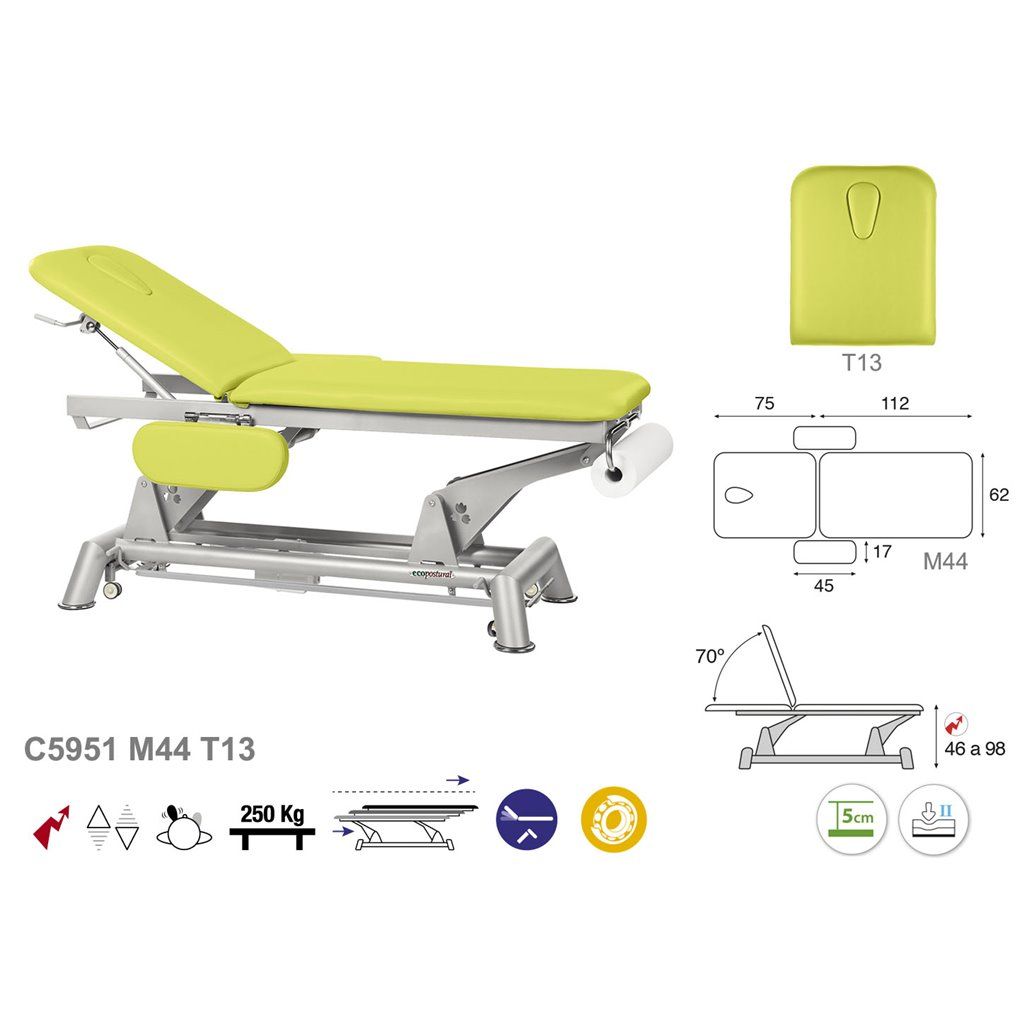 La table de massage électrique C5951 est réglable en hauteur par système périphérique. Elle dispose de roulettes escamotables grâce à une seule pédale, d'un porte rouleau rabbatable, d'accoudoirs rabbatables de série et d'un dossier proclive à 70 °. Sa têtière dispose d'un trou visage avec bouchon inclus.
