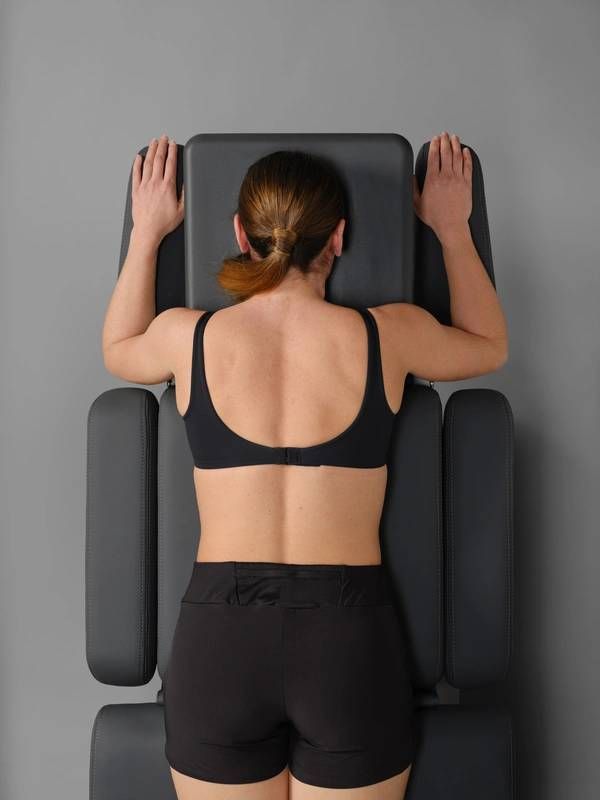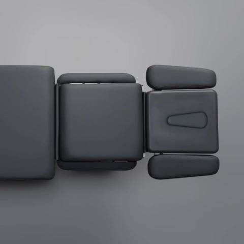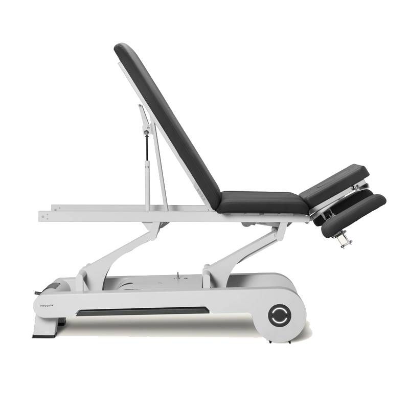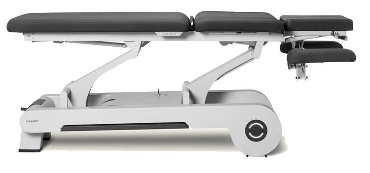 Grâce au système TwinLift, les accoudoirs ergonomiques sont réglables en continu par vérin à gaz. Cette technologie permet au patient d’ajuster sa position librement, favorisant une relaxation optimale en position ventrale. Le mécanisme est spécialement conçu pour ne pas gêner le praticien, même lors d’un travail assis près de la têtière.