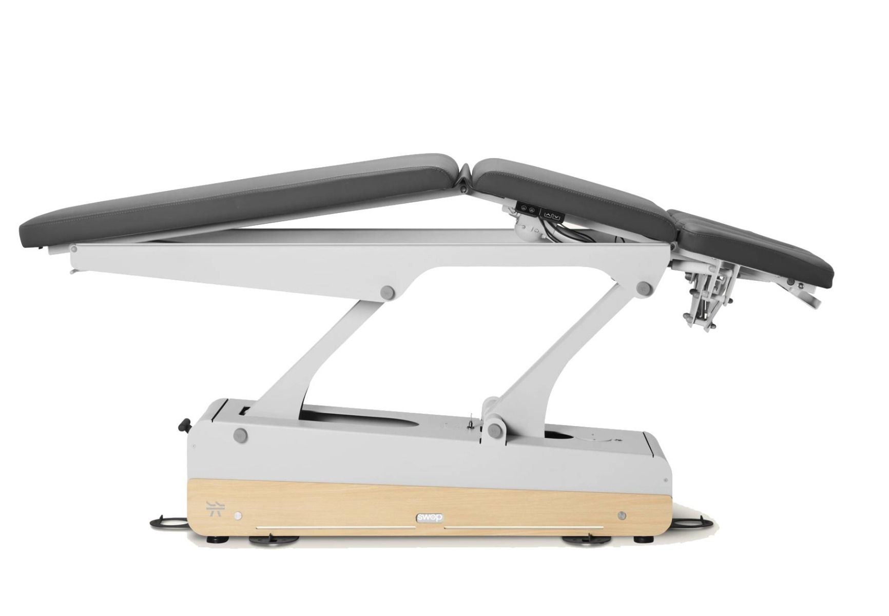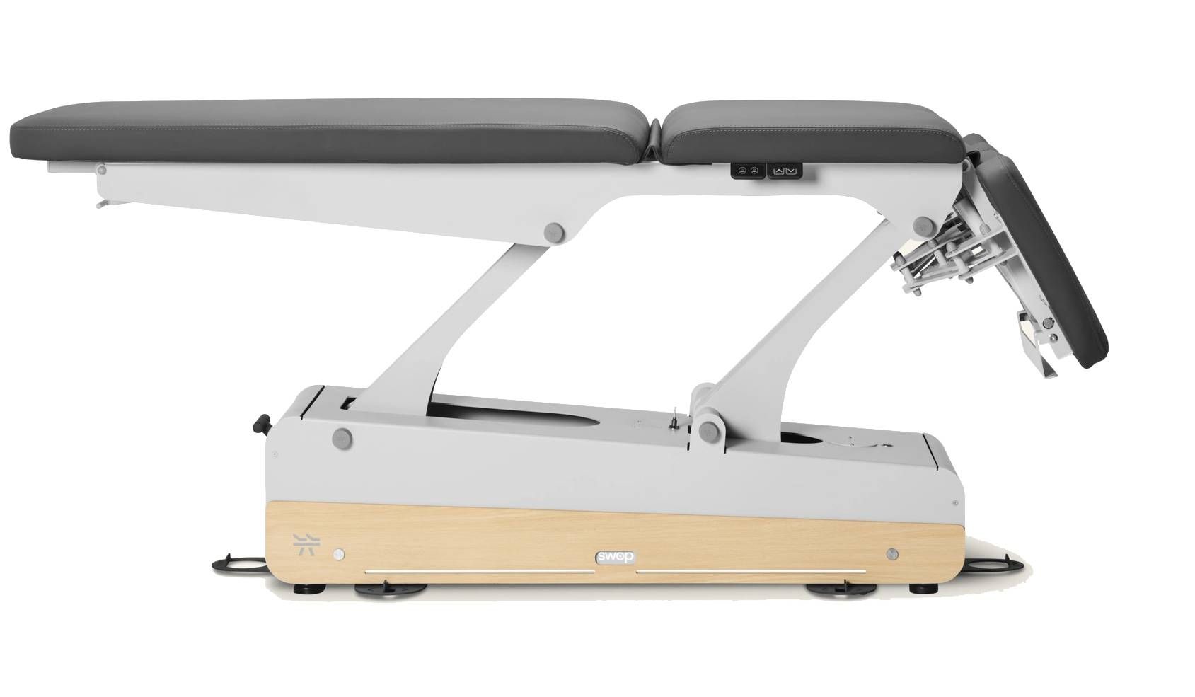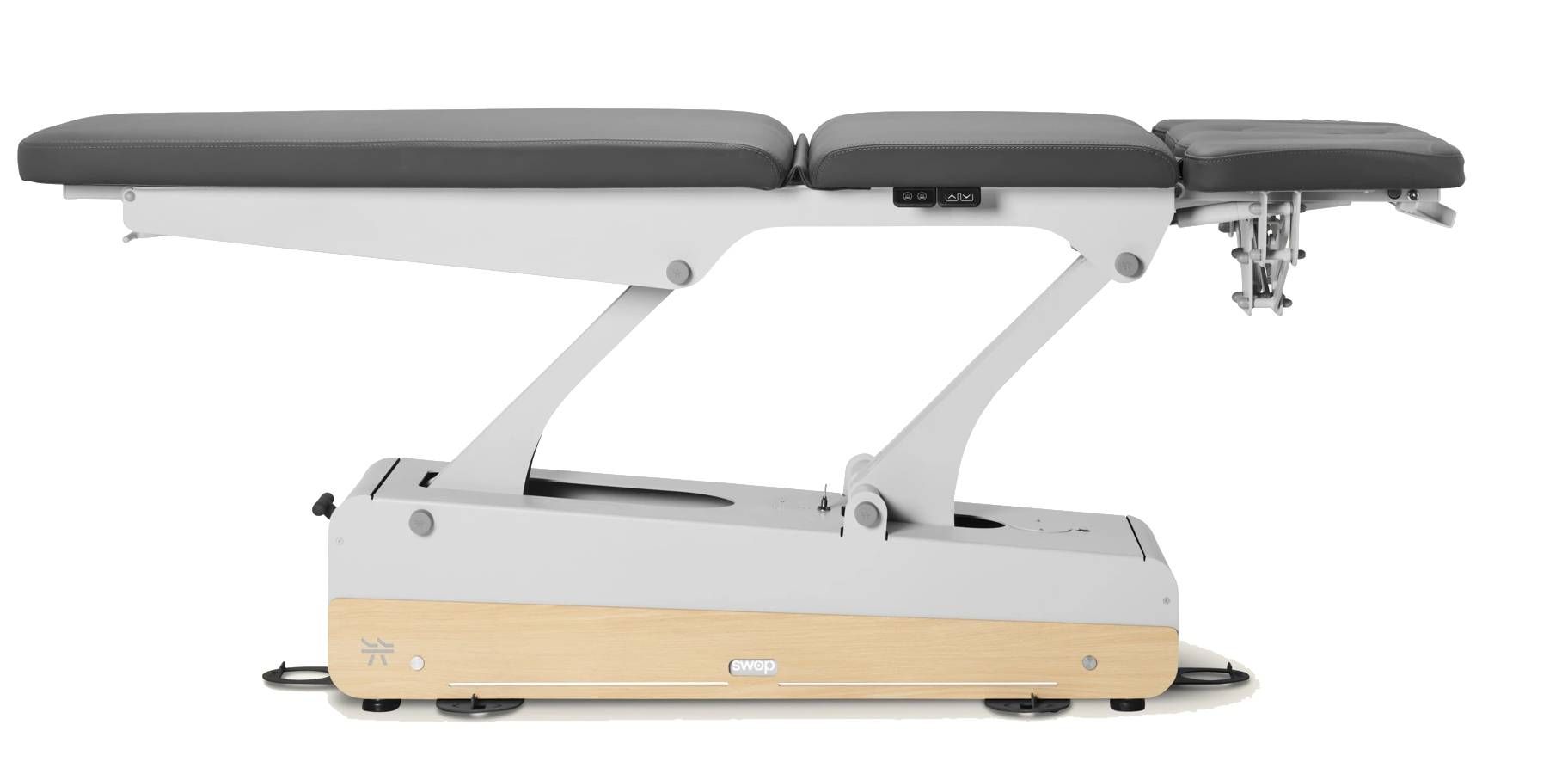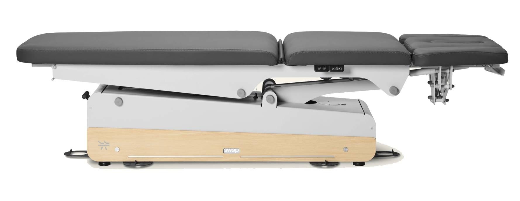 Dotée d’une configuration à 5 plans et équipée de 2 moteurs silencieux, la Swop 5 UP Physio permet un réglage précis et rapide de la hauteur et des différentes sections du divan. Le matelas chauffant intégré procure une chaleur relaxante, favorisant la détente musculaire et un relâchement profond du patient, tout en facilitant le travail du praticien lors des manipulations.