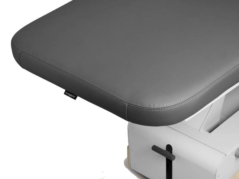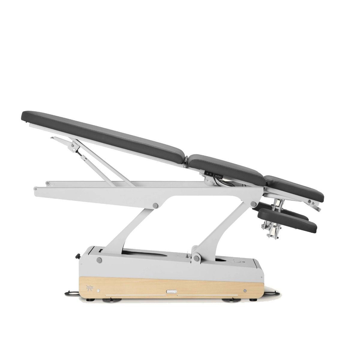 Son cadre périphérique à commande circulaire, breveté, permet un réglage intuitif de la hauteur sans les mains, offrant une ergonomie optimale pour des séances prolongées. Les accoudoirs TwinLift, réglables en continu, assurent une position physiologique idéale pour le patient en décubitus ventral tout en réduisant la fatigue du praticien.