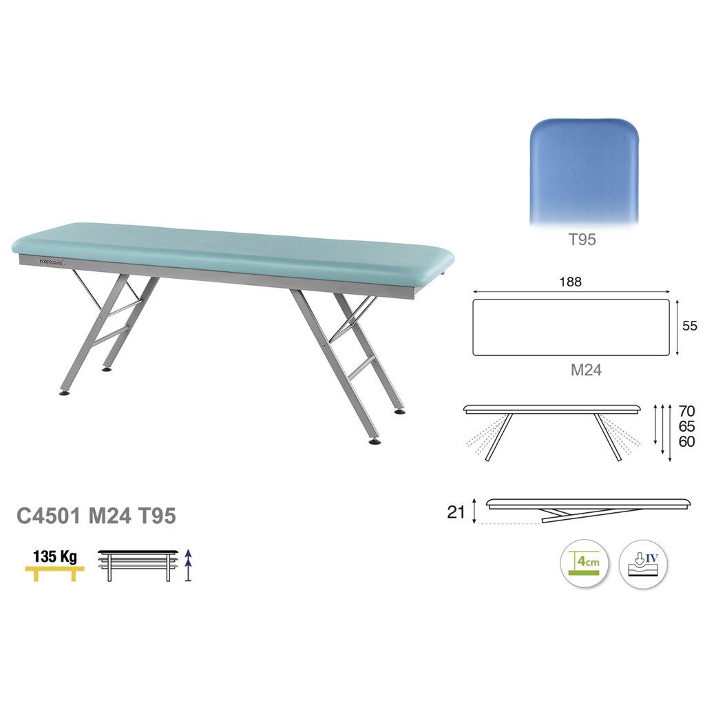 - Table 1 plan (1section) - Réglage de hauteur à: 60 – 65 – 70 cm - Structure fabriquée en tube d’acier laqué avec peinture gris époxy cuite au four à 250º - Pieds repliables - Sellerie standard: mousse de polyuréthane de 5 cm d´épaisseur et soutien IV-Très ferme - Charge maximale admissible:135 Kg - Simili cuir ignifuge de catégorie M2