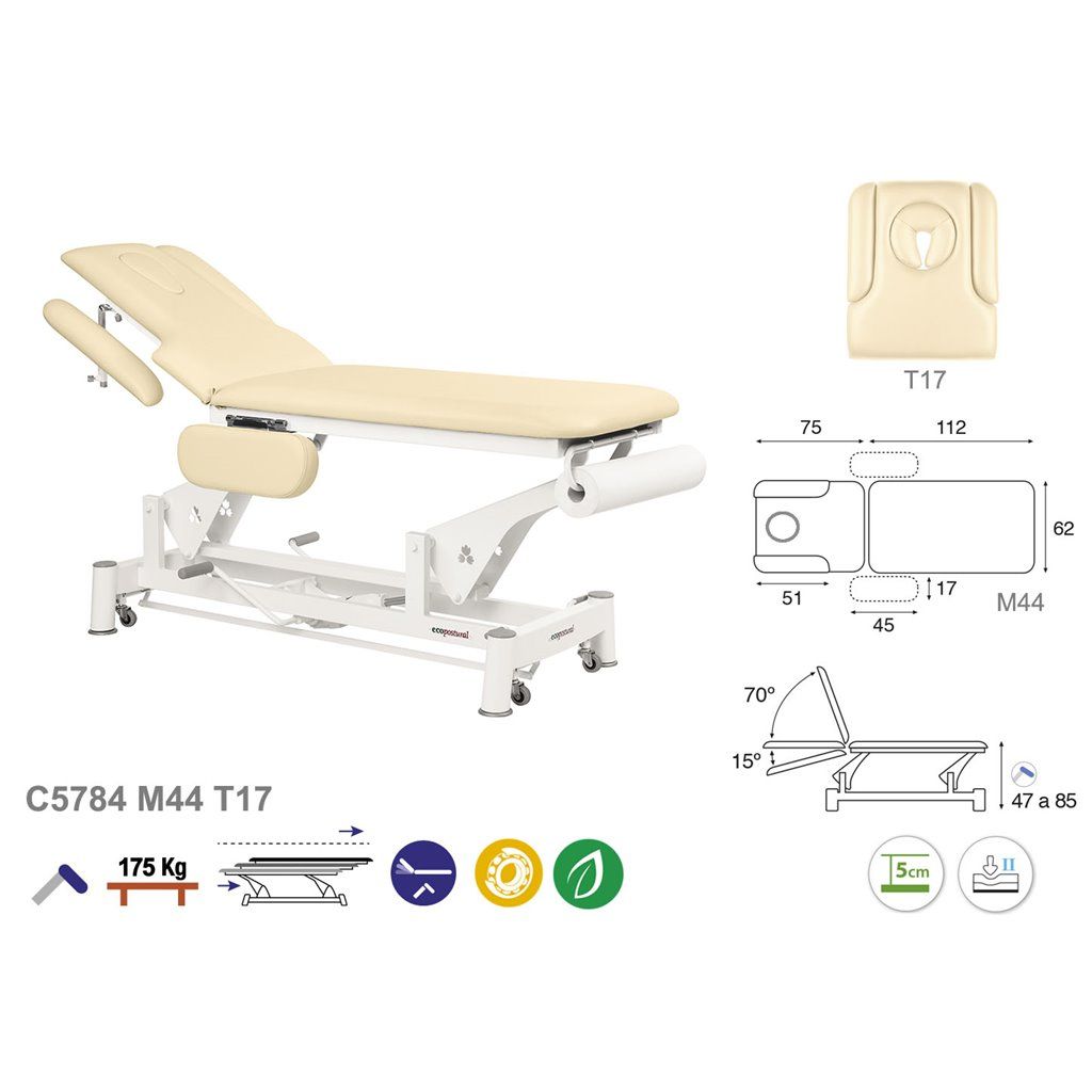 Découvrez la nouvelle Table de massage hydraulique 2 plans Ecopostural C5784, une table de massage disposant de 2 plans et 6 sections avec un jeu d’accoudoirs rabattables (fixes).