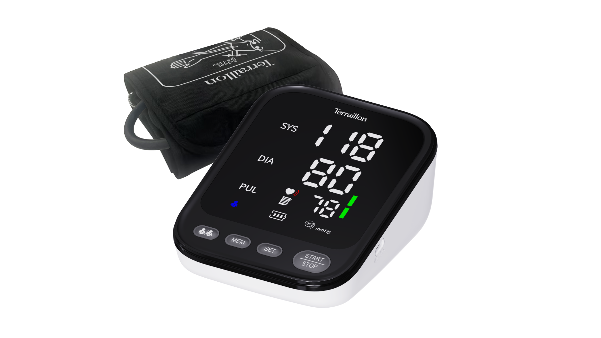 Le tensiomètre électronique au bras Terraillon offre une surveillance fiable de la tension artérielle grâce à une technologie avancée et une prise en main intuitive. Son grand écran LCD rétroéclairé affiche clairement les valeurs systolique, diastolique, le rythme cardiaque ainsi que les éventuelles arythmies, avec une échelle colorée conforme aux recommandations de l’OMS pour une lecture facilitée.