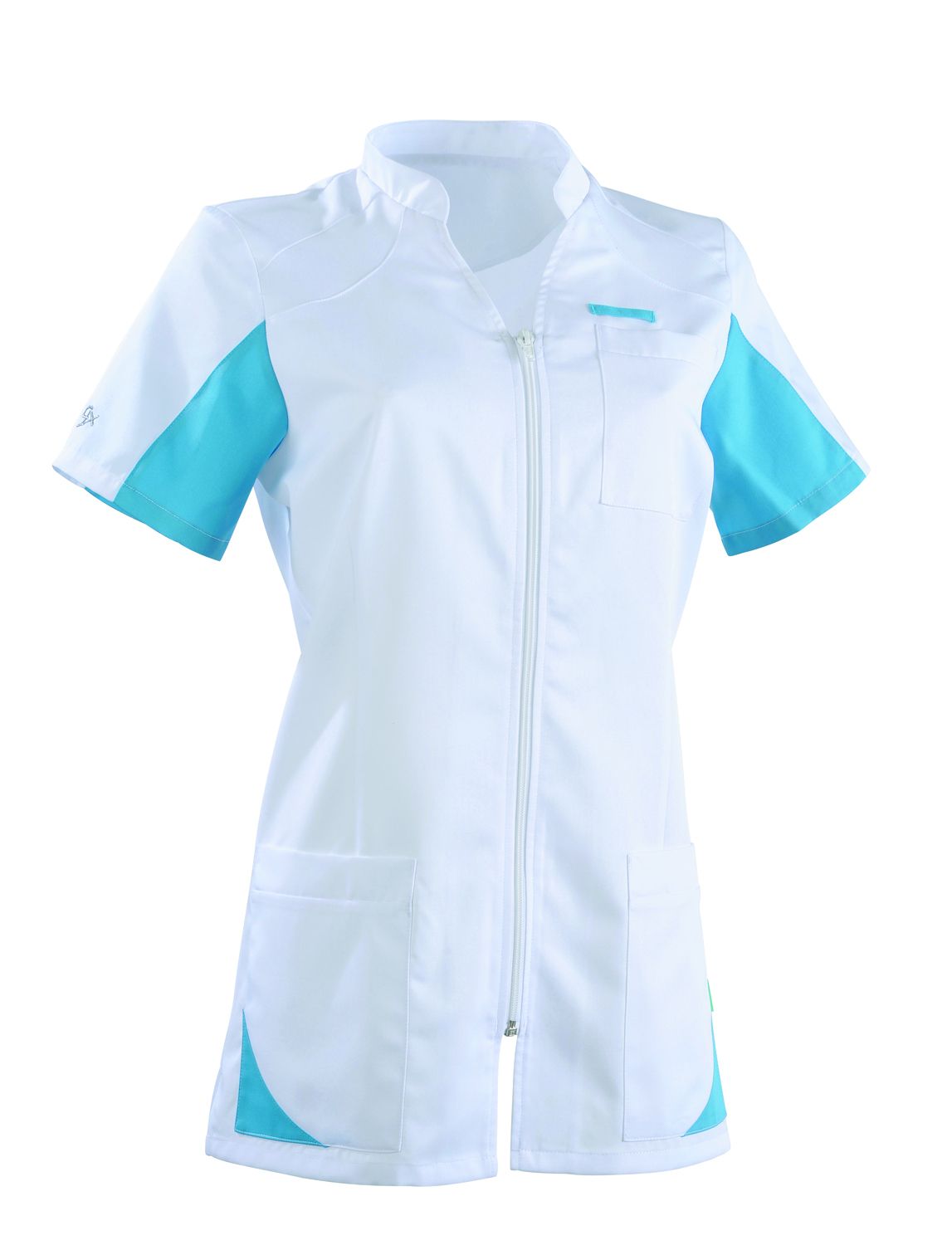 Tunique médicale femme SANDRINE Clemix 2.0 Blanc / Turquoise - Col officier avec encolure en V - Fermeture centrale zippée - Manches courtes - Poche poitrine - Poches basses - Fentes côtés - Longueur dos : 75 cm - Tailles disponibles : de 0 à 6